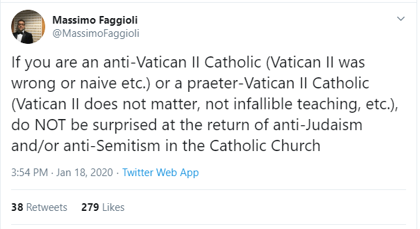 So, I suspect that we traditional Catholics are about to be branded wholesale as “antisemites.” And I think we’re already getting some hints of that. See Mass Faggi’s quote below, and then search “Catholic” and “Antisemitism” on Twitter, and you’ll find more. Just wait until they start cherry-picking documents that support this lie from the archives. I hope I’m wrong. We’ll see.