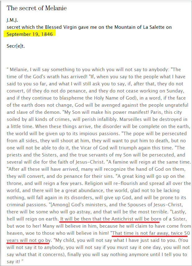 “It will be then that the Antichrist will be born … That time is not far away, twice 50 years will not go by.”