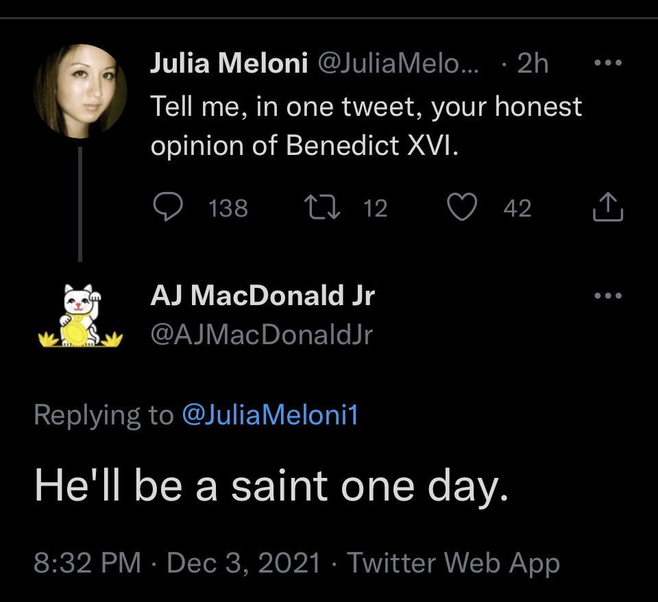 The most painful thing I’ve had to learn in this process is that the character of Pope Benedict XVI that I knew and loved was a complete fabrication of Cardinal Wreckovation Ratzinger.